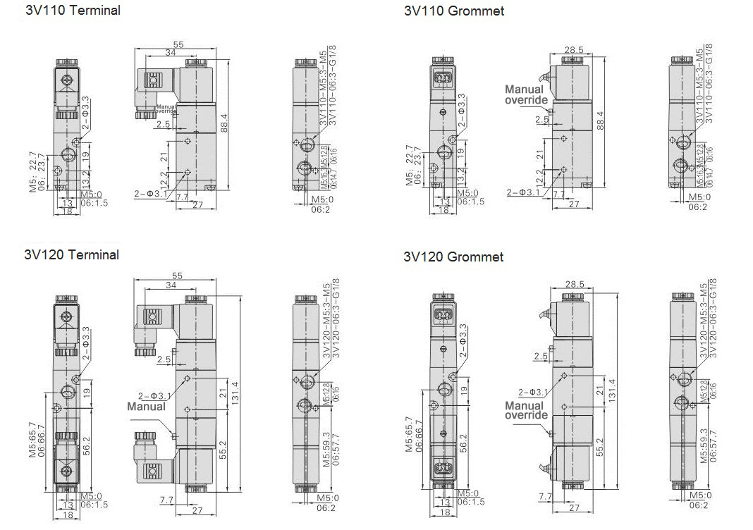 3V110-06 DC24V 2 Position 3 Way Solenoid valve 3V110-M5,3V120-06