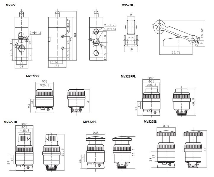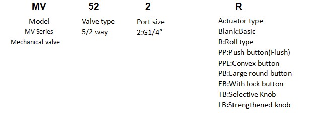 • Type:Roller type pneumatic valve MV-09 (MV522R),MV522 Basic type air operated valve,MV522PP Flat head push button valve, MV-10(MV522TB) Locking hand control valve,MV-08(MV522TB) Rotary type mechanical operated valve